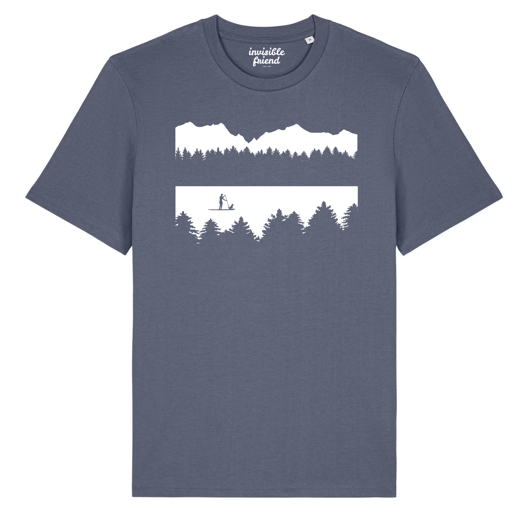 A lone paddle boarder (and a dog!) on a calm mountain lake. This t shirt features a male figure, but we also produce this design with a female paddle boarder.