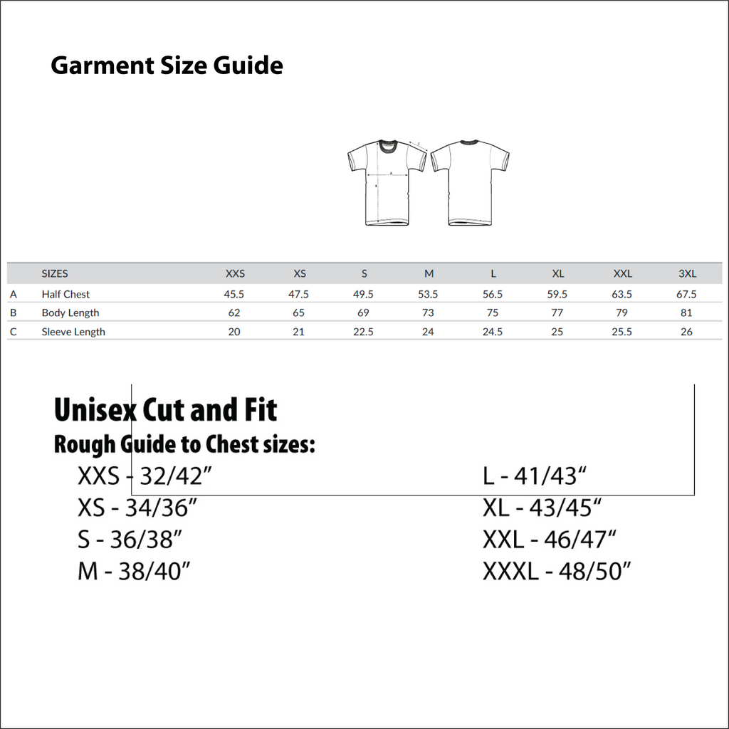 Our adult t-shirts are a slim (not fitted) but comfortable unisex fit, as a rough guide they will fit the following chest sizes: